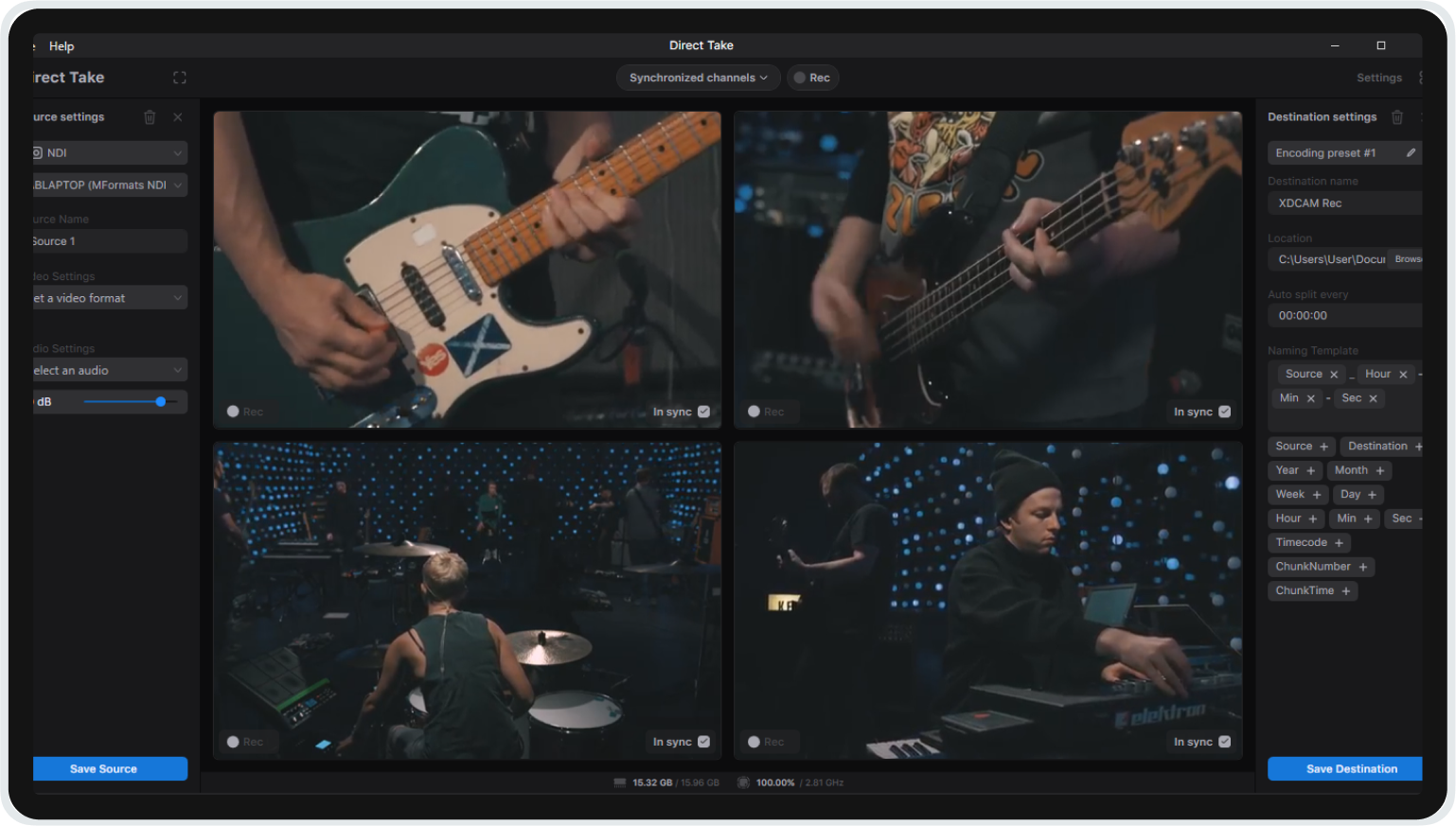 Multiple recording destinations for every source. Synchronous frame-accurate recording of several different sources.